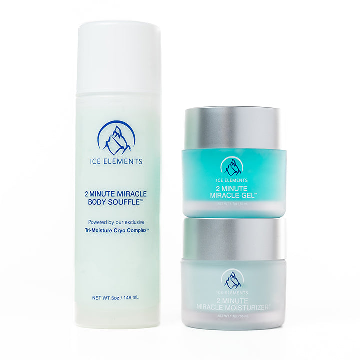 Infused with our Tri-Moisture Cryo Complex™ Indulge in the luxurious transformation of your skin from face to feet with the Ice Elements Terrific Trio. This extraordinary set combines the exfoliating power of the 2 Minute Miracle Gel, the deep hydration of the 2 Minute Miracle Moisturizer, and the all-over rejuvenation of the 2 Minute Body Miracle Souffle.